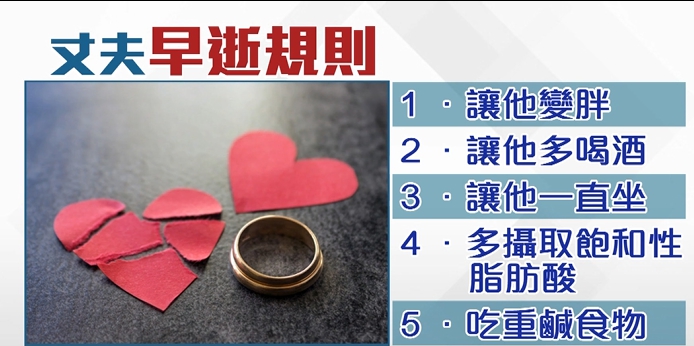 哈佛大學營養學教授,也曾發表,丈夫早逝10條規則,像是讓老公變胖、多喝酒,還有久坐丈夫早逝食譜,以及多攝取飽和性脂肪酸,又或吃重鹹食物,原本是希望,夫妻間能相互留意彼此生活習慣,沒想到流傳到日本,卻在主婦間廣為流傳,甚至黑化成了丈夫早逝食譜。從詛咒網站,到早逝食譜,也看出日本夫妻互動暗藏危機。