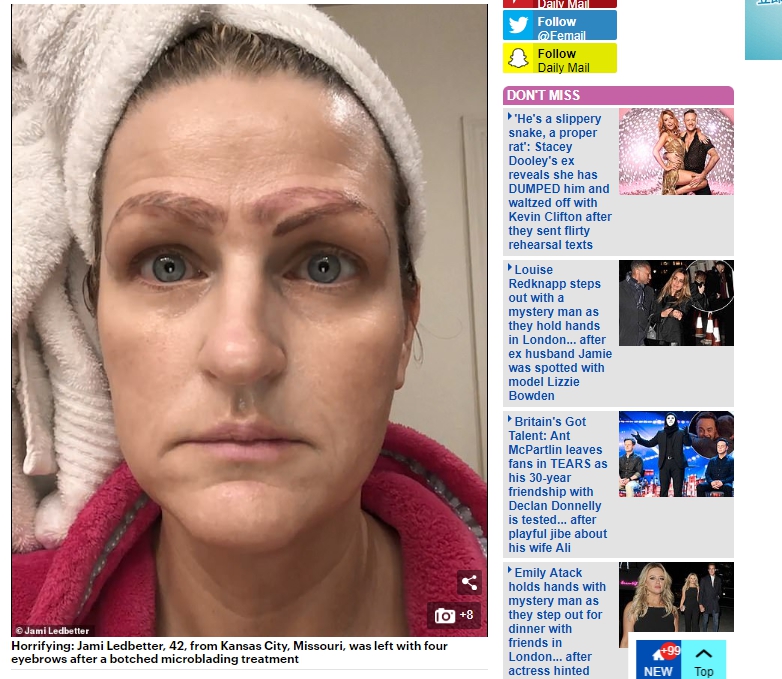 從照片中可見,迦米「霧眉」和原本的眉毛位置完全不同,讓她的眉毛遠看很粗,近看就像有4道眉毛一樣,迦米痛苦的說,自己曾嘗試用化妝遮掩,不過根本沒用,她的生活也遭受巨大影響,現在她除了上班之外,頂多只去雜貨店買點食物,其他時間足不出戶,甚至還有一個正在交往的男子,看到她這樣就提出分手的要求,不再和她約會,讓她身心都相當崩潰。
