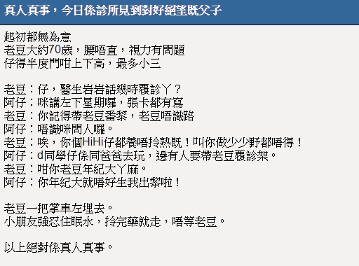 有網友在《高登討論區》PO文,表示自己在診所見到令人心碎的一幕,一位視力不好、腰挺不直,年紀大約70歲的老伯伯,帶著一位身高僅有半個們高,大約9歲、就讀國小三年級的兒子,兩人在診所內討論複診的時間。