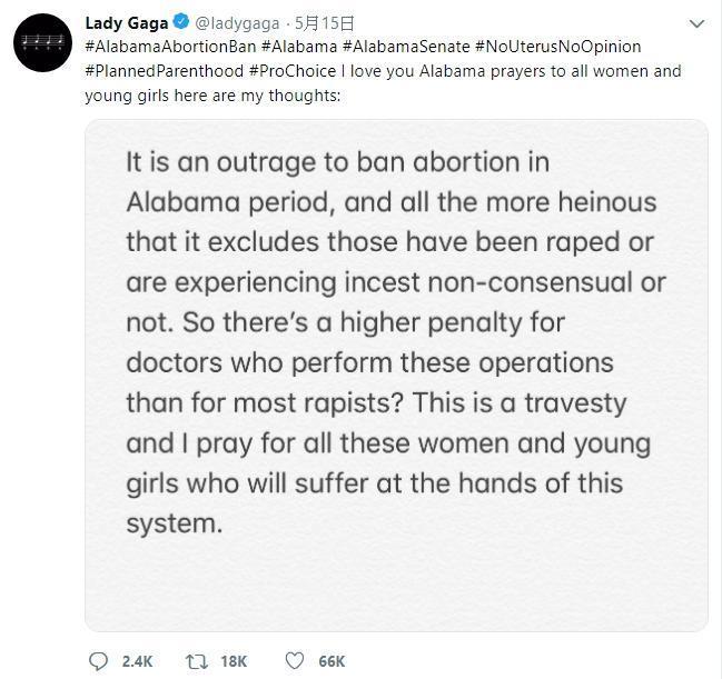 美國阿拉巴馬州在當地時間15日通過一項備受爭議的反墮胎法,該法案不僅要求女性從懷孕開始的那一刻起就不得墮胎,還規定即便是因被性侵或亂倫導致的懷孕,也不准墮胎。這是美國史上最嚴格的反墮胎法案,對此不少名人都站出來反對這項法令,女神卡卡(Lady Gaga)在推特公開發文反對阿拉巴馬州反墮胎法案,蕾哈娜(Rihanna)更直接在IG貼出同意法案的男議員照片。