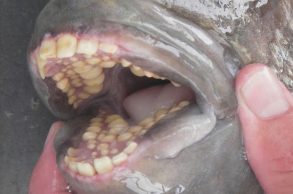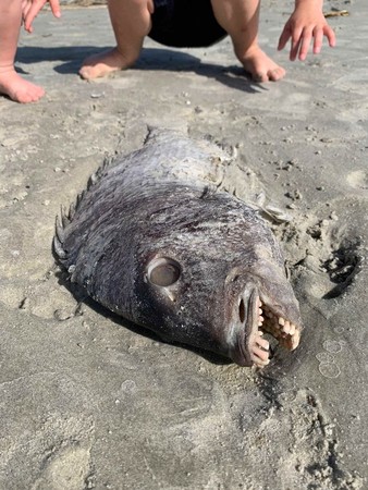魚竟然長著人類的牙齒?美國喬治亞州一名31歲母親布羅絲,日前趁著好天氣,帶3歲兒子到海邊散步玩水,卻發現沙灘上有一具「魚屍」,不但體積比一般的魚來得大,牠的嘴裡也沒有尖牙,而是像人類一樣的整齊牙齒,連上下顎都長滿了白牙,看起來相當令人發毛。