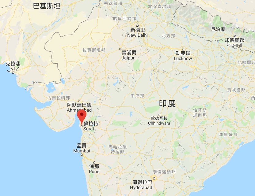 ▼印度西部城市蘇拉特(紅標處)一棟建築24日發生大火。(圖/翻攝自Google地圖)