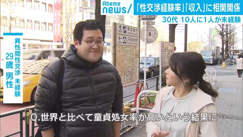 對此,朝日電視台訪問一名還沒有過性經驗的29歲男子,他至今還是 打工族,沒有交過女朋友,被問到沒有任何戀愛經驗的原因,男子也坦承,「我很怕會被甩所以不敢主動出擊」,也表示如果有錢的話,自己可能會更有自信,但還是有多數人並不認同這個說法,這項研究也還沒有結束,似乎不能太早就下定論。