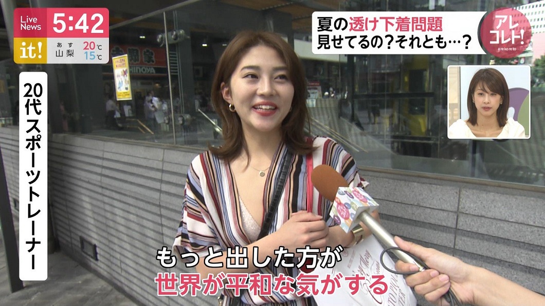夏天一到,路上的女性都各個打扮清涼,輕薄的布料讓內衣若隱若現,引人無限遐想,日前日本電視台就針對此議題進行街頭訪問,其中一名長相氣質的正妹竟表示,「內衣露多一點,會讓世界更和平」,驚人發言引起網友熱議,紛紛狂讚這名正妹,「她應該獲頒諾貝爾和平獎!」