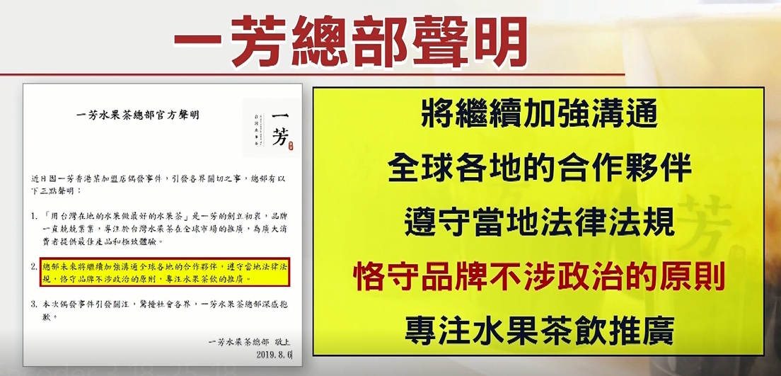 一芳在大陸推出了黑糖珍奶,相當受到消費者歡迎,但是因為香港的事件,現在有消費者開始要抵制他們了,有店員透露業績起碼減少一半以上。