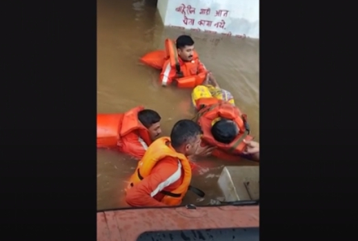 老弱婦孺穿上救生衣再被救出,印度豪雨帶來的洪水,淹過了許多民宅和店家的一樓,還有民眾被困在湍急洪水,直升機垂下繩索救援,險象環生。