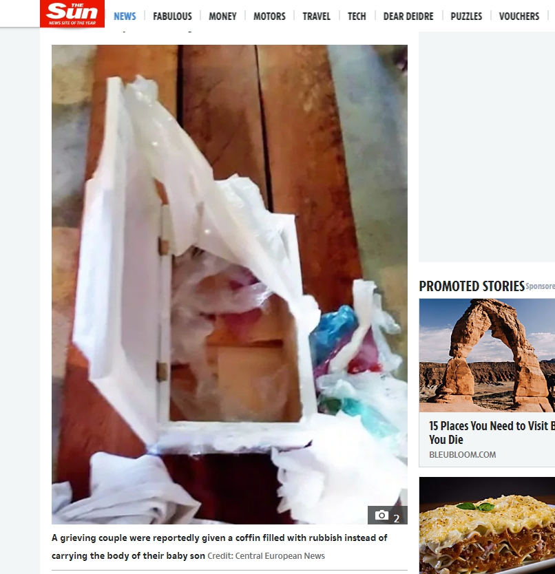 在傷口上灑鹽!墨西哥一對夫婦,上周五(9日)生下一名男嬰,不過男嬰一生下來就相當虛弱,被送醫急救,沒想到隔天一早,夫婦就收到男嬰死亡的消息,不過院方並沒有交代男嬰死亡的原因,僅說還要調查,並請夫婦去領取男嬰的遺體,沒想到夫婦倆一打開棺材,竟看到一堆垃圾在裡面,讓他們心痛不已。