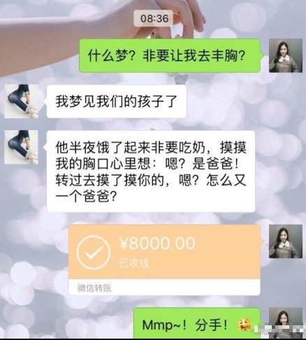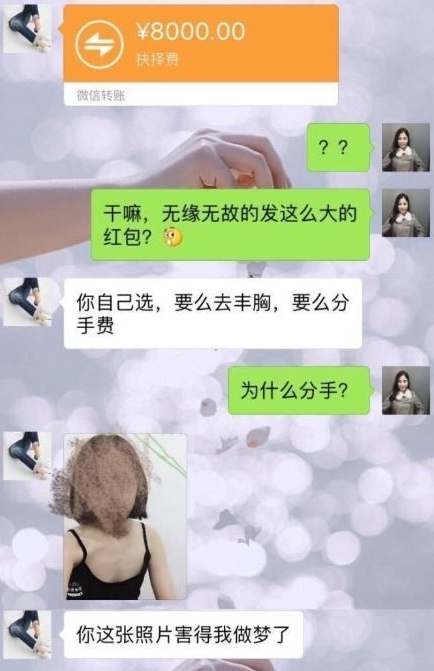 女子在微博貼文,表示收到8000元人民幣(約台幣4萬元)時一頭霧水,對此男友回說「要嘛去隆胸,要嘛當分手費!」,隨後男子解釋看到她的性感照,害得他做了一個夢。