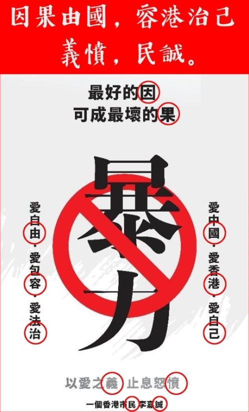 香港首富李嘉誠在多份香港報刊上刊登廣告,首次發表對於香港當今局勢的看法,他寫下「最好的因,可成最壞的果,愛中國、愛香港、愛自己,愛自由、愛包容、愛法治。」配上反暴力的圖樣,結果被眼尖網友發現,竟藏有大彩蛋!受港網友們大力推崇。