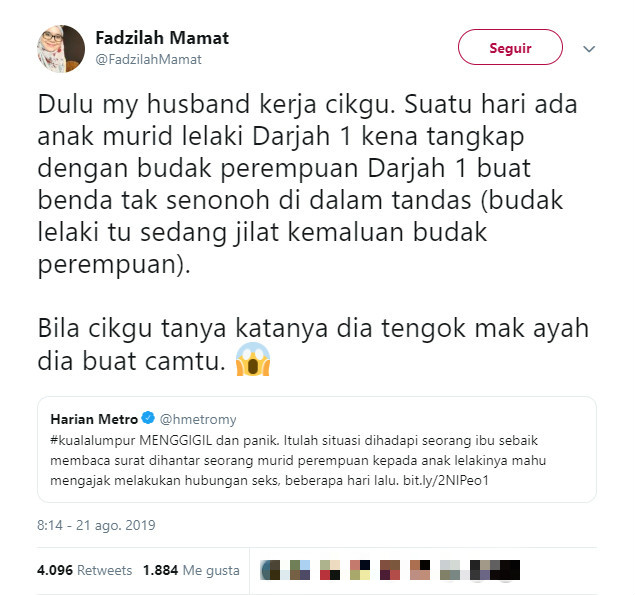 推特網友法茲拉(Fadzilah Mamat)日前轉推《大都會日報》(Harian Metro)有關女童情書的新聞,透露自己的丈夫是一名老師,有天上課發現有學生不見了,便到處尋找,沒想到在廁所撞見2名年僅7歲的孩童,做出親密行為,男童正在用嘴巴服務同年級的女學生,嚇得當場詢問:「你在那裡學的?」豈料男童天真地回答:「爸媽都這樣啊,我看到爸爸這樣對媽媽」,讓老師聽完無言以對,不知怎麼接話。