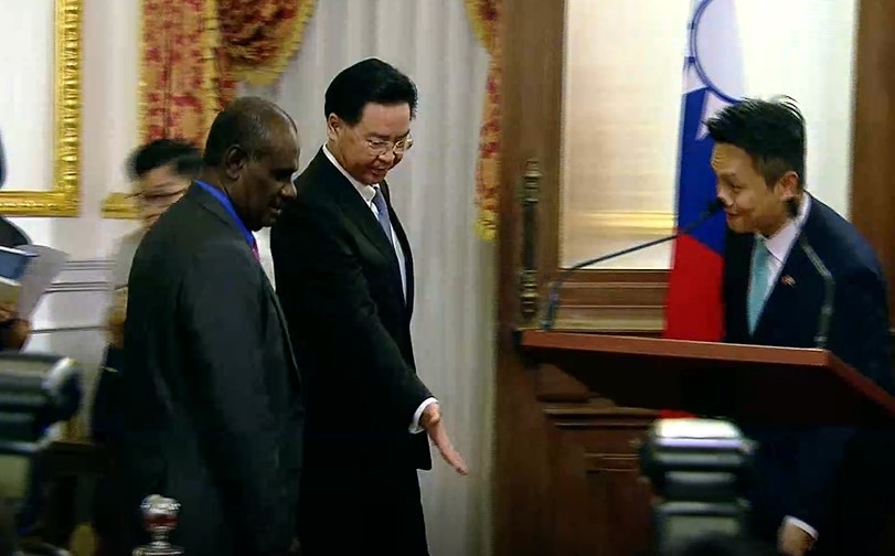 索羅門外交部長馬內列剛致詞完,外交部長吳釗燮想要握手,但索羅門外交部長轉身沒看到,吳釗燮一度尷尬收回手指,直到更靠近對方,才終於以側身的方式,雙方握到手!。