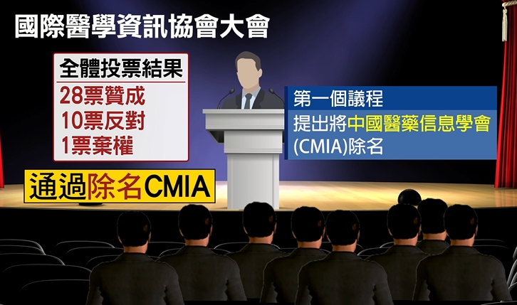 過去就曾經因為中國大陸影響,打壓台灣地位,不過這一次國際大會上,在第一個議程時,現任主席就提出將中國大陸醫藥信息學會CMIA除名,全體投票結果,28票贊成,10票反對,1票棄權,通過此案,將中國單位除名,根據了解,是因為中國醫藥信息學會過去擔任主辦方時地點一改再改,前後更動四次,加上有一筆費用沒有繳回大會,才會被除名。
