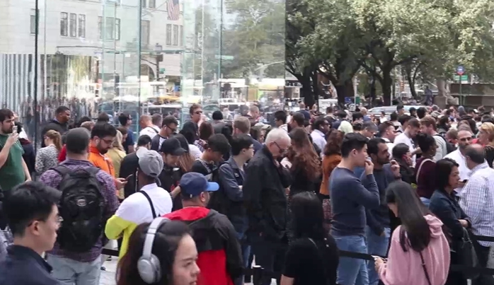 門打開人湧入畫面,蘋果新手機iPhone11系列在美國時間9/20早上八點正式開賣,在紐約第五大道的蘋果旗艦店外擠滿了排隊等候的果粉,平均每個人要排三到四個小時才能夠買得到。