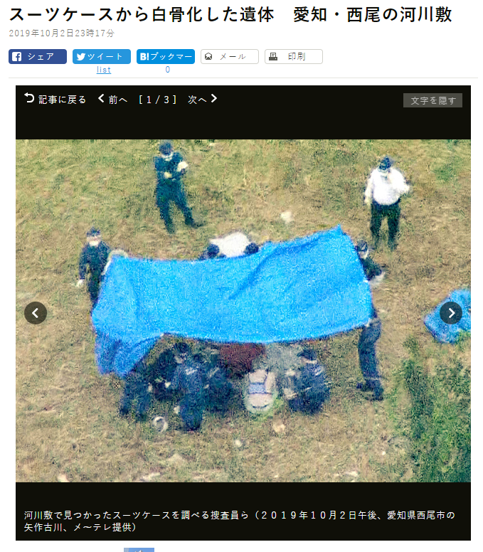 日本愛知縣西尾市發生一起行李箱腐屍案!2日在當地河邊有人找到一個紅色行李箱,聞到裡面散發出陣陣異味,驚覺情況不對便馬上報警,警方趕赴現場後,發現行李箱裡有一具「抱膝而坐」的女屍,且已經白骨化。目前,警方懷疑女屍身分為日前失蹤的大陸籍女子。