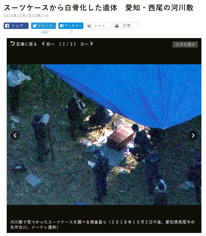 綜合日媒報導,當時西尾市附近河邊,有三名割草人員正在執行工作,其中一名男性工作人員,在割草時,不斷聞到某處傳來一陣陣惡臭味,之後便看到草叢中有一個疑似被遺棄的紅色行李箱,便隨即報警處理。而行李箱被發現時,是在與人等高的草叢內,並不能從周圍直接看到。