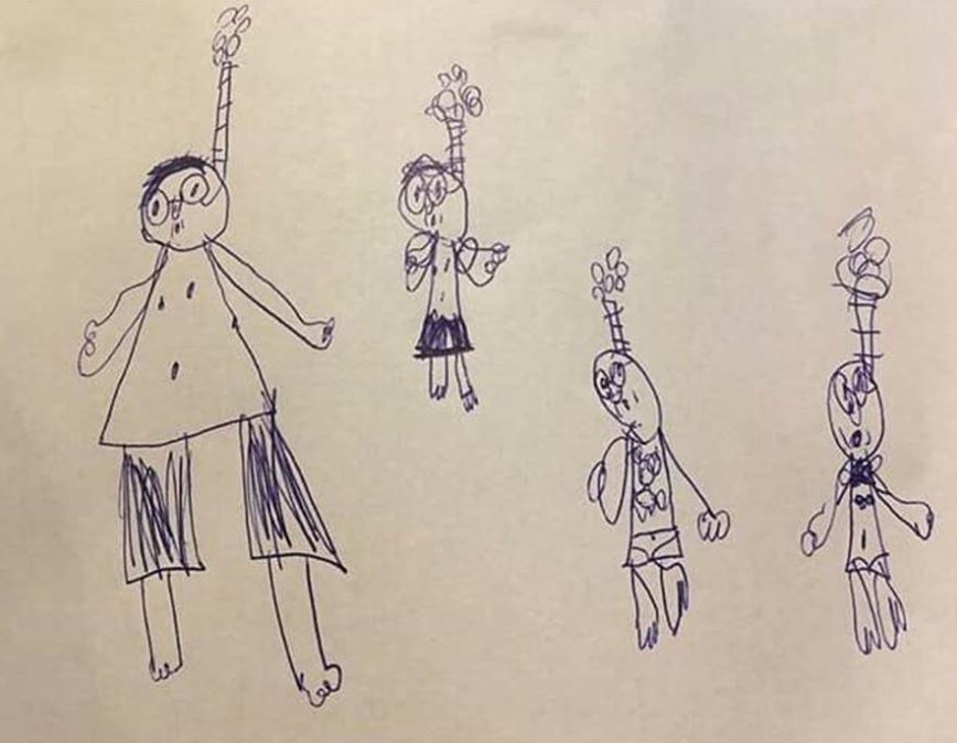 國外一名老師在《reddit》分享一張學生的繪畫照片,只見圖中有4位看似輕生的死人,不僅表情痛苦,連輕生用的繩子也都畫得有模有樣。老師發現這張圖畫後,直覺不妙,擔心孩子是否受到虐待或者另有隱情,便上前關心詢問學生圖畫的內容。