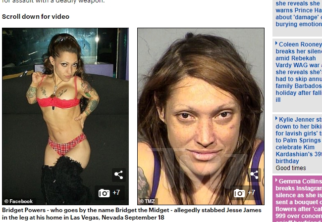 布里奇立刻對男友詹姆斯(Jesse James)大吼:「該死!我知道你不愛我了!」巨大聲響也讓詹姆斯和一旁的女人驚醒,女人驚恐表示,當下看到布里奇不斷對詹姆斯痛罵,接著拿起刀來,就往詹姆斯的小腿肚狠刺,且還一度試圖刺向她,不過並沒有成功,後來自己被嚇得趕緊抱起布里奇,並往門外丟。布里奇待在門外,事後決定報警,並自首道:「這都是我的錯,我應該坐牢」,然而當警方問到布里奇是否住在男友住處時,布里奇回答「是」,不過女人卻痛斥:「不!她沒有!她正試圖刺殺我男友」。