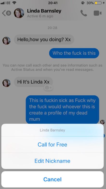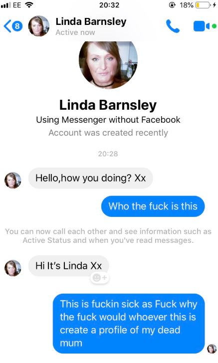 媽媽的臉書帳號突然傳了一句,「哈囉,你好嗎?親親」讓巴恩斯利震驚地回覆,「妳是誰?」而對方也回答,「嗨,我是琳達,親親」,巴恩斯利明白這一定不是他的母親,氣憤地說,「這他X的太變態了!不管你是誰,為什麼會用我死去媽媽的身分來創建帳號」,對方便再也沒有回應。
