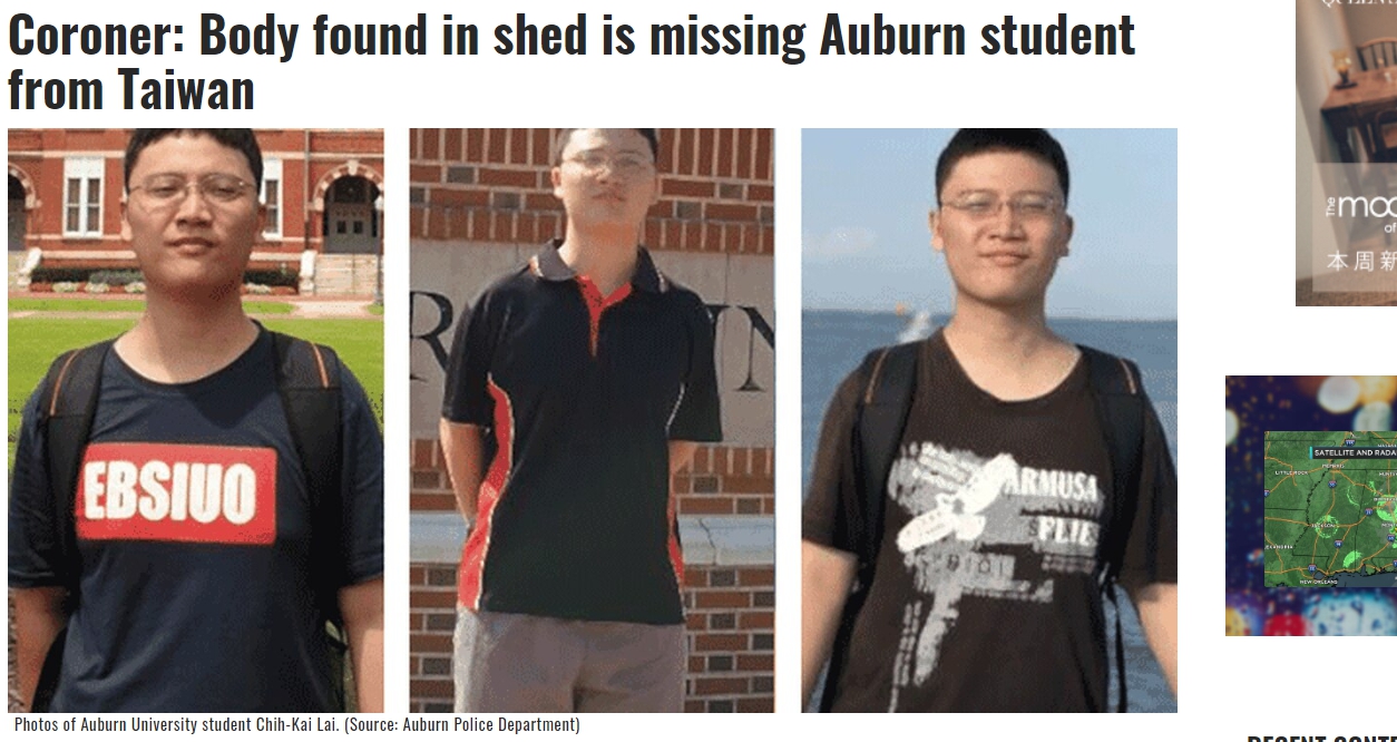 今年7月前往美國阿拉巴馬州留學傳出失蹤的台灣賴姓學生, 當地警方10日指出, 找到一具遺體, 經過指紋確認是賴姓同學. 目前初步勘驗, 並沒有謀殺的跡象,但確切死因仍然在調查中。我國駐亞特蘭大台北經濟文化辦事處表示,在接到消息的第一時間已經陳報外交部,將全力協助家屬來美國處理後續相關事宜,並和警方及相關部門保持聯繫,提供調查協助。