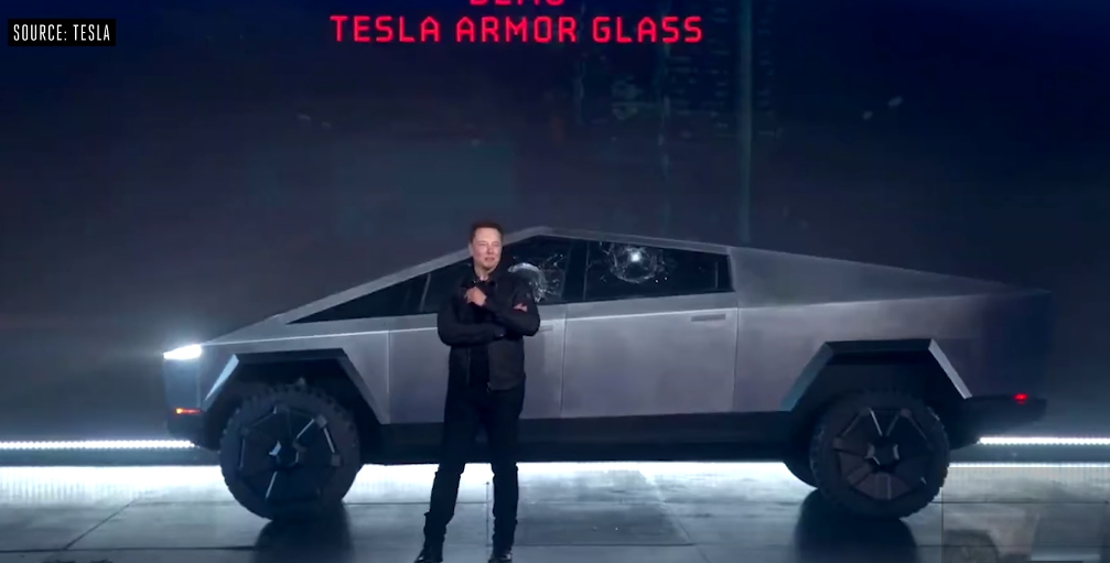 車門挺住了大鐵鎚重擊,接下來馬斯克還介紹新車的裝甲玻璃,號稱可以擋9釐米子彈,特斯拉更精心安排橋段,讓人手持鋼球丟向車窗玻璃。