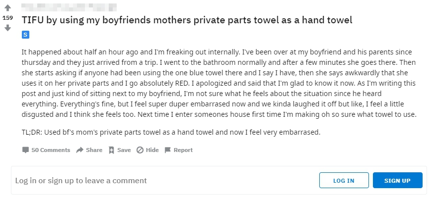 不久後,男友媽媽也進了廁所,但下秒卻突然走出來,向在場地所有人問了一句:「有人用過廁所裡的藍色毛巾嗎?」傑瑪瞬間意識到自己似乎做錯事,有些心虛地坦承自己用過,這時她才知道,原來那是男友媽媽用來清潔「女性私密處」的毛巾,隨後她尷尬地向對方道歉,雖然男友及其他人對這件事沒太大的反應,但傑瑪認為,「不管是我還是男友媽媽,應該都覺得有些噁心吧!」