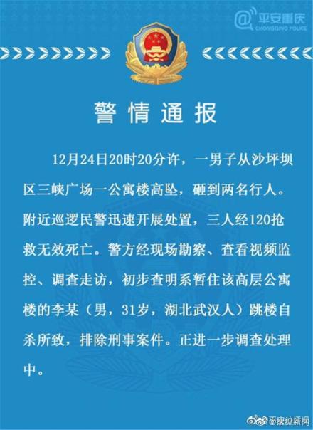 報導也指出,重慶市綦江區教育委員會表示,被砸中的2名路人是在該區學校就讀的高三女學生,當時2人正準備參加術科考試,才經過商場前方。警方則表示,3人搶救後還是不治身亡,經過警方現場勘驗及調閱監視器畫面,初步查明,整氣事件是李男從住家(即商場上方公寓)輕生所致,排除刑事案件,正在進一步調查當中。