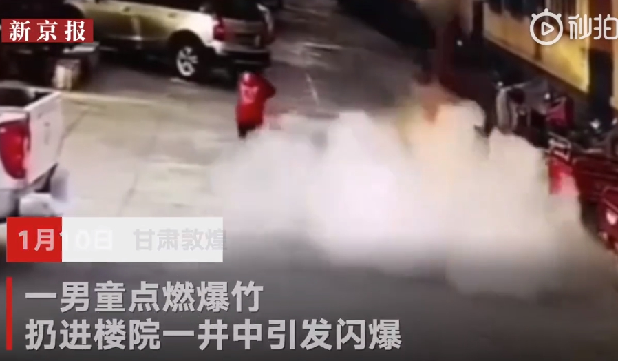 綜合陸媒報導,事發地點位於甘肅省敦煌市,一名身穿黑衣的8歲男童和同學在走路回家的途中,調皮將鞭炮從人孔蓋孔丟進下水道,而底下恰好是化糞池管道,因此瞬間引發沼氣爆炸,人孔蓋噴射近3公尺高,男童則遭到近距離氣流衝擊,人被衝飛到空中後重摔在地。