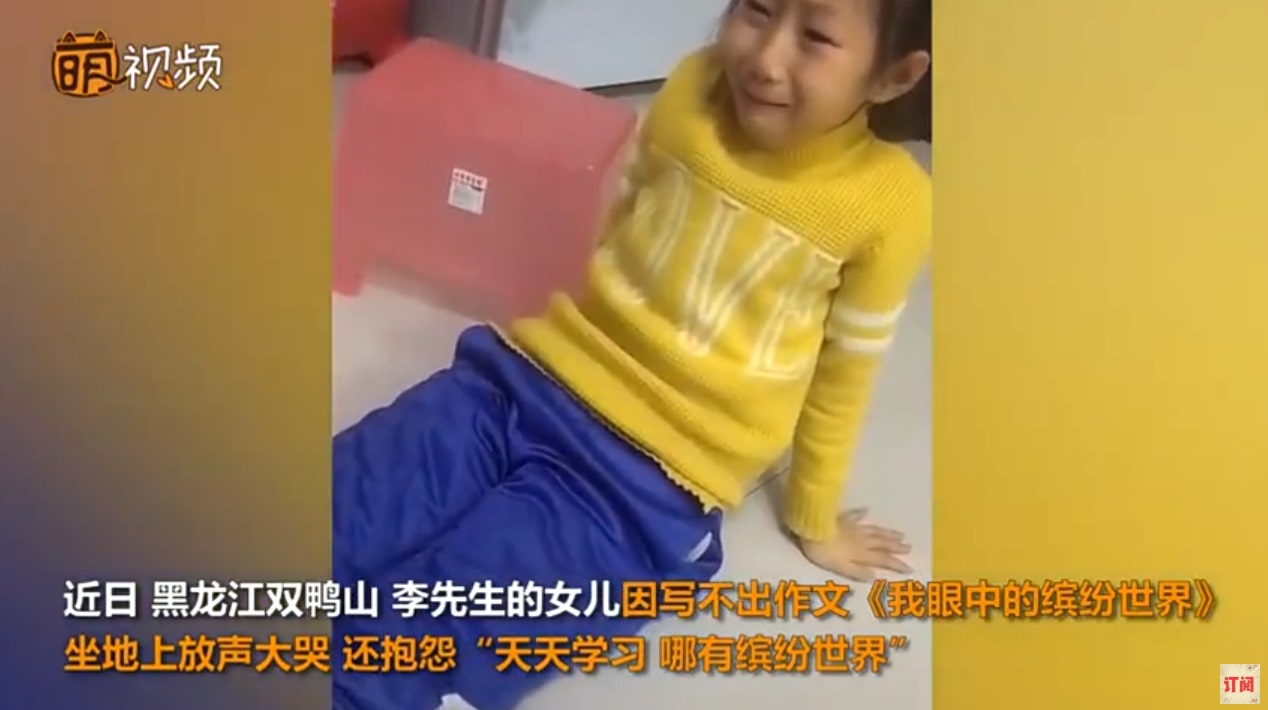 綜合陸媒報導,近日網路流傳一段影片,一名女孩因為寫不出作文,而懊惱直呼:「《我眼中的繽紛世界》根本不會寫!」甚至還坐在地上嚎啕大哭,看起來十分無助,爸爸見狀後便詢問她,「怎麼不會寫呢?妳的繽紛世界是什麼呀?」女孩則用哭腔回答:「沒有,天天學習哪有繽紛世界呀!」語畢,她雖堅強的用衣袖擦擦眼淚,但下秒卻又忍不住悲傷,繼續啜泣。