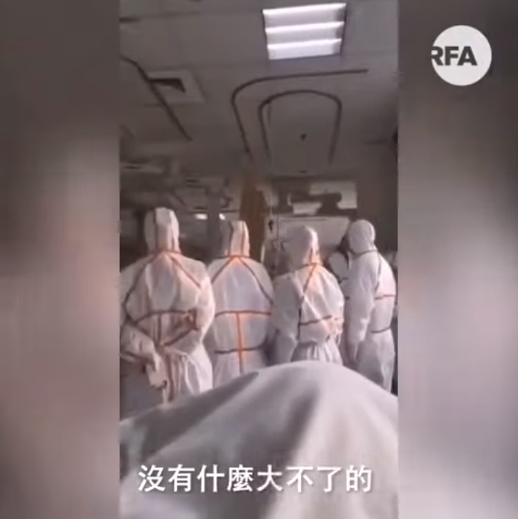 《自由亞洲電台》( RFA )20日在YouTube上傳一段12秒的影片,表示武漢肺炎爆發後,疑似有病人拍到武漢一間醫院內的情況,只見醫護人員全都換上防護衣,全副武裝後才敢進入隔離區照顧病人,但躺在病床上拍攝影片的男子,似乎認為院方太過緊張,無所謂地說道:「情況就是這個情況,沒什麼大不了的,搞得這麼嚇人!」並發出有點不屑的嗤笑聲,完全不了解事態的嚴重性。