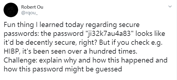硬體與軟體工程師Robert Ou日前在推特發文,表示一組英數混用的密碼「ji32k7au4a83」,在他眼裡應該是一個亂數組成的超安全密碼,但在密碼資料庫(Have I been pwned)卻顯示,這份密碼已經外洩過上百次,讓他相當驚訝「有人可以解釋嗎」。