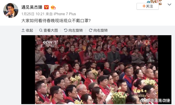 微博用戶「遇見吳杰臻」上傳一張2020央視春晚的照片,畫面中可見,現場坐滿了觀眾,每個人都專注的看著前方的表演,但值得注意的是,目前正值武漢肺炎疫情嚴重時期,但卻沒有人戴上口罩防範,這畫面讓原PO嚇傻了,不禁詢問:「大家如何看待春晚現場觀眾不戴口罩?」