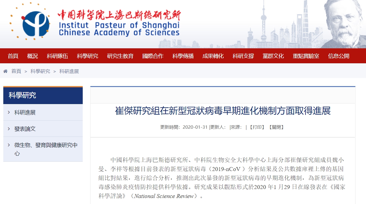 ▼大陸科學家發現2019新型冠狀病毒出現驚人突變。(圖/翻攝自上海巴斯德研究所官網)