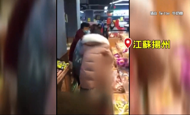 店員說,原來是有人插隊造成後方不滿,才引發全武行,鏡頭轉到另一間超市前面,民眾顯然有秩序多了。