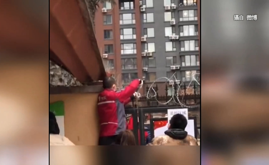也因為各城市到處封城,管制人員出入,送快遞的只好利用竿子把貨品吊進社區。