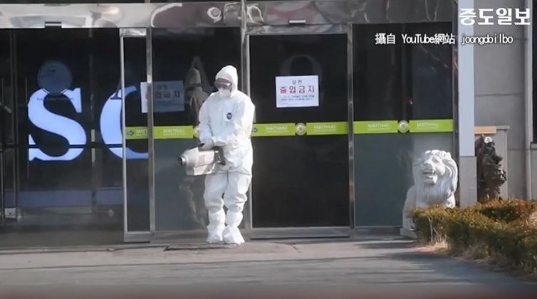 南韓防疫人員全副武裝,穿著防護衣,拿著機具 在新天地教會前,噴灑消毒水,南韓武漢肺炎確診個案,至今已經超過500例,我國針對日韓兩國旅遊,疫情建議,也已經升高至第二級警示,但確診病例 其中六成,大多都與新天地教會有關係。