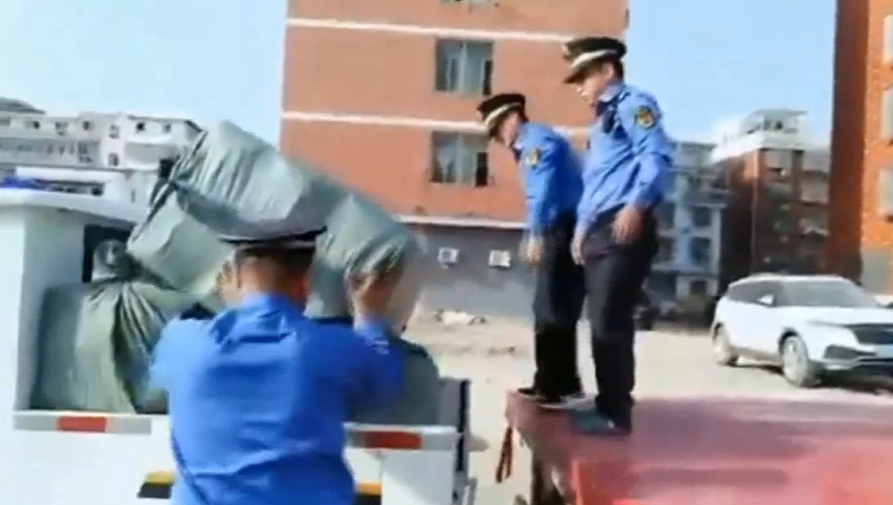 ▼城管把救災物資搬到卡車上。(圖/翻攝自推特/東森新聞)