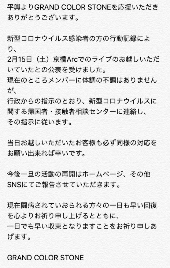 受到武漢肺炎疫情影響,許多歌手以及樂團陸續取消大大小小的公演,讓不少粉絲覺得相當惋惜。對此,「GRAND COLOR STONE」坦言,「我們已經做好面對批評的覺悟,也許取消演出會使這個月的收入掛零,但等到疫情結束後,大家再一起玩吧!」即使飽受負評,樂團仍公開向民眾喊話的舉動,感動許多網友,還有人稱讚,「願意跳出來面對大眾,真是勇氣可嘉」。