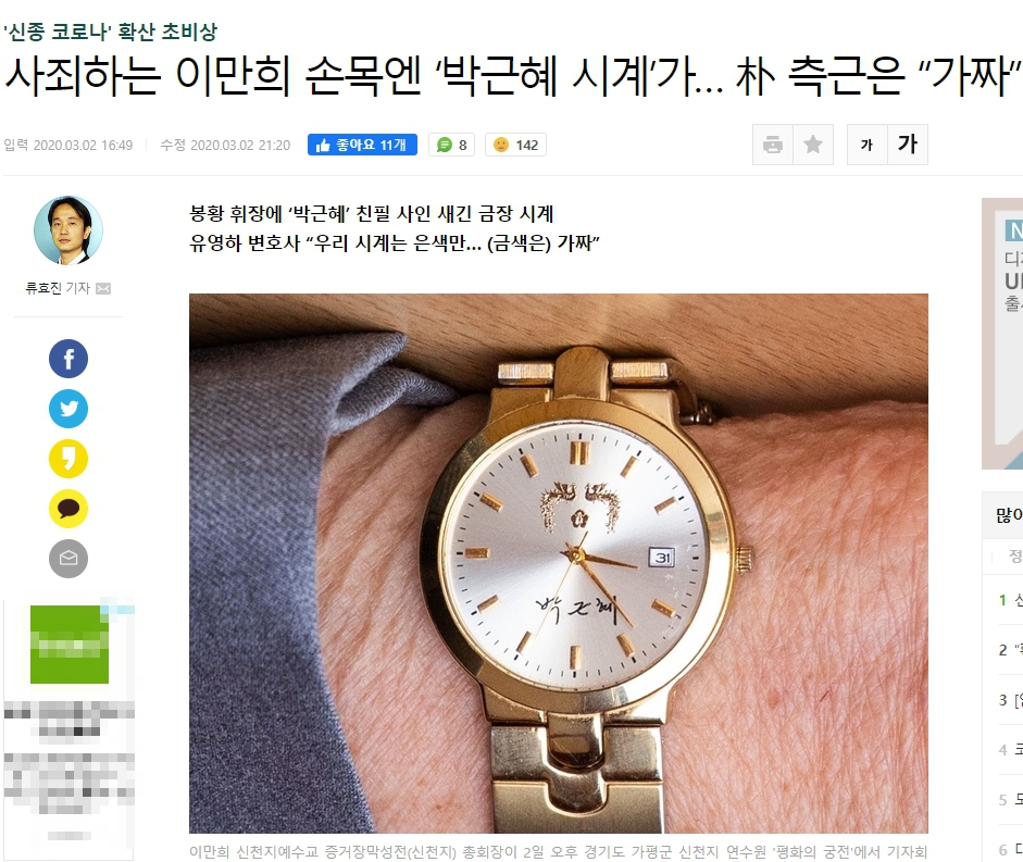 南韓的武漢肺炎疫情2日下午再增加123人感染,累計確診達4335人,超過6成患者是新天地教會教徒,神隱多時的教主李萬熙2日首度出面,說「非常沒有臉面對大家」,還當場下跪求原諒。新天地教會以嚴格控制教徒手段出名,常被外界指控為邪教,不過李萬熙本人二月底也被進行病毒篩檢,結果是呈現陰性,還有韓國媒體發現,他手上戴的金錶是前總統朴槿惠的紀念手錶。