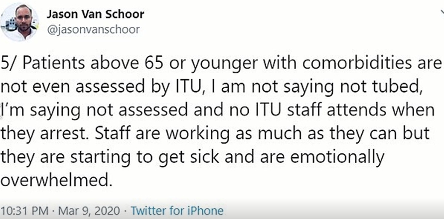 根據英國每日郵報報導,有一名在英國倫敦大學學院擔任麻醉醫師的史庫爾就在推特上代為轉達義大利醫師朋友的心聲。