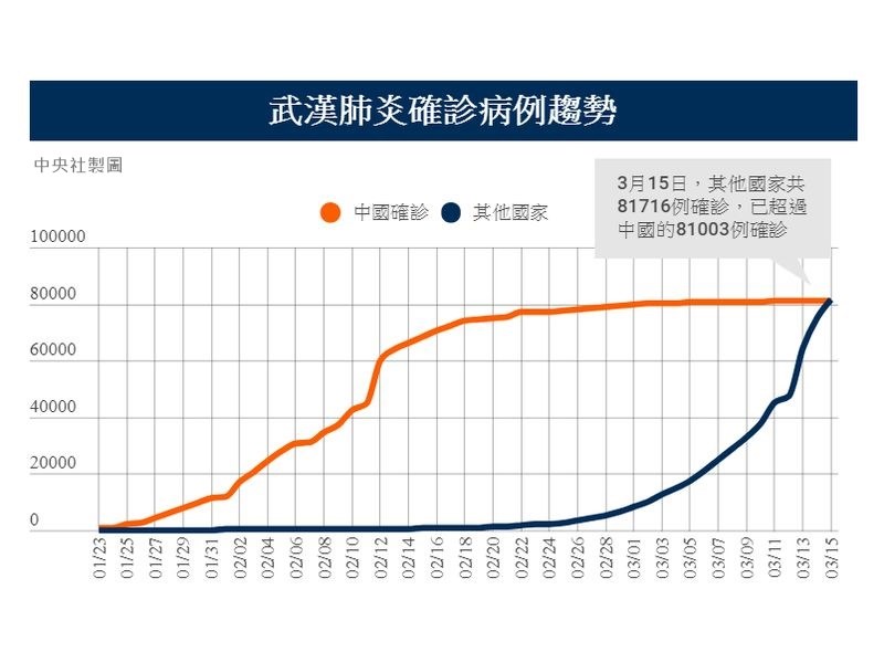 武漢肺炎蔓延全球,隨著疫情流行中心從中國大陸轉至美國與歐洲,中國大陸以外感染此病死亡人數首度超過中國大陸的死亡人數,歐美越來越多國家採取限制旅遊和禁止集會等措施遏止病毒傳播。