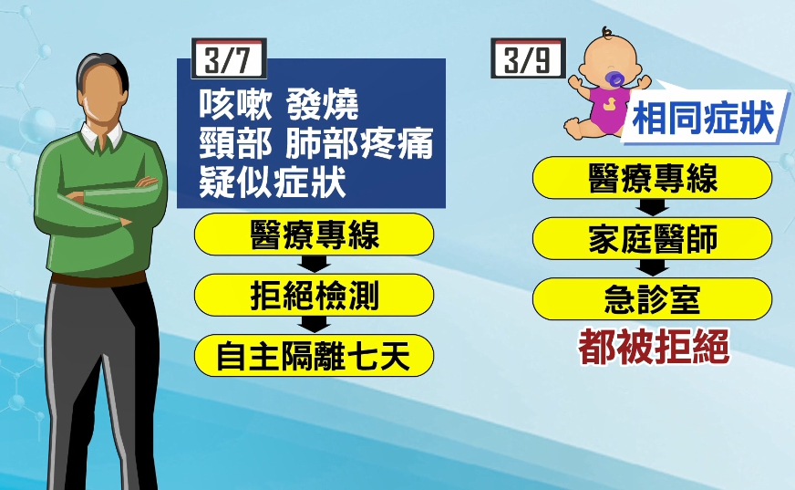 攤開時間順序,從3月7日開始,她的先生就出現,咳嗽、發燒、頸部和肺部疼痛,等等武漢肺炎症狀,打去醫療專線不但拒絕檢測,也不讓他們去醫院 ,只能自主隔離七天,3月9日女兒也出現相同症狀,求助醫療專線家庭醫師急診室,都被拒絕至今都無法知道,女兒的症狀究竟從何而起。
