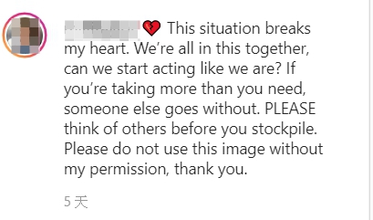 原PO透過IG分享照片,表示「看到這情況我真的覺得快心碎了...。我們都是站在同一陣線的,應該要開始互相幫助。如果你拿的物資已超過你的需求,就會有人買不到,因此請在囤貨前,多替別人想一下,謝謝!」