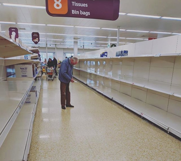 網路上最近瘋傳一張照片,賣場中可見一名白髮蒼蒼的老先生,站在兩排空無一物的貨架前,低頭失落地看著一張疑似購物清單的小紙條,什麼都買不到,讓民眾看了覺得相當心痛,並把眼前的景象拍下PO網,盼社會大眾能多體諒老弱婦孺的需求。