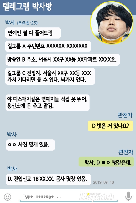 韓媒《Dispatch》2日時公開了N號房聊天截圖,其中至少有10位女藝人的名字被提及,就連身分證、住址等資料都被洩漏,趙主賓甚至向會員宣稱他手上握有D女星的裸照,還透露F女星因某些原因成為性奴,而照片只有VIP會員能夠看到。