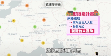 根據網路連結,再透過即時地圖,讓旅居歐洲的民眾,一目了然住家附近有多少台灣人,需要任何協助能馬上就近求救。
