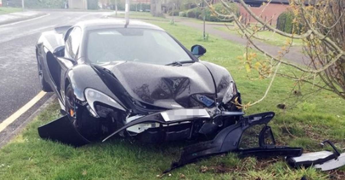據英國《鏡報》報導,這輛「麥拉倫650S」(McLaren 650S)撞樹後,車頭全毀,零件四散,甚至車尾還