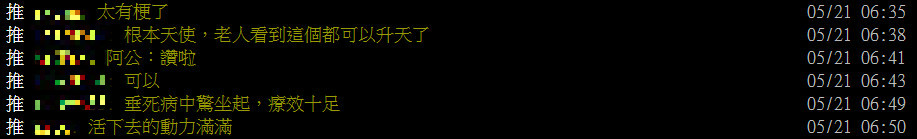 消息被轉發到PTT八卦板,網友紛紛留言,「真猛」、「都不用打強心劑了多好」、「垂死病中驚坐起,療效十足」、「阿公都救回來了」、「活下去的動力滿滿」、「阿公都救回來了」、「物理跟心理一起治療」、「處分啥?真正白衣天使啊」。