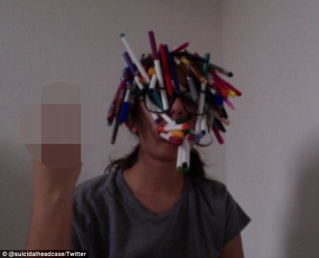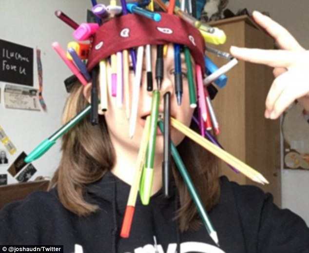 想知道自己的頭上可以「插」多少文具,於是她拍了一張滿頭文具的照片上傳