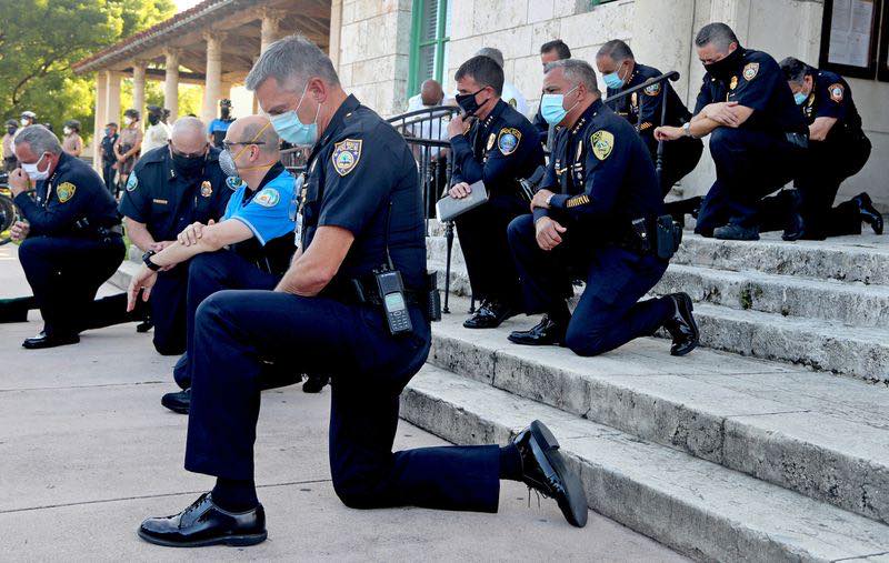 除了這次黑白種族大和解的事件外,國外也有人在臉書上分享一張警察下跪的畫面,原本應該和示威者站在反方的警察,竟然加入抗議陣營,共同悼念遇害的非裔男佛洛伊德,甚至還有美國警察高舉「反警察暴力標語」,為了就是要支持抗議群眾,且為同仁的不法行為道歉。