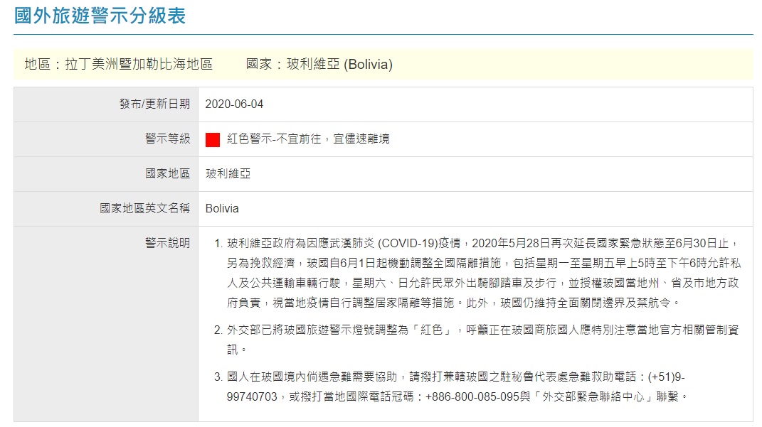 據悉,玻利維亞於本(2020)年3月10宣布國內2例武肺病毒後,疫情就尚未緩和,目前已有2萬多人確診,死亡人數也超過600人,疫情爆發後,玻利維亞政府立刻宣布緊急狀態至5月28日,不過疫情遲遲未趨緩,所以延長至6月30日,並在6月1日起機動調整全國隔離措施。而根據我國外交部領事事務局官網,於6月4日的發出的「國外旅遊警示分級表」指出,玻利維亞為紅色警示,呼籲民眾不宜前往、儘速離境。